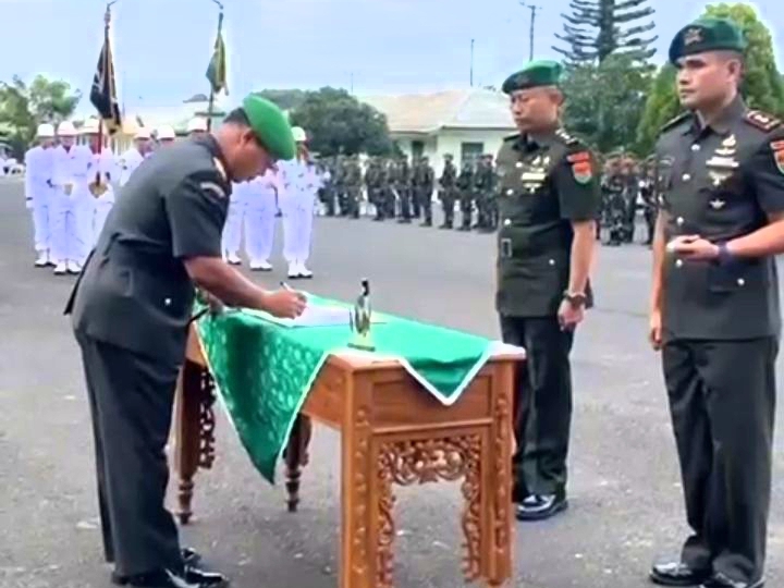 REJANG LEBONG– Danrem 041 Garuda Mas (Gamas) Bengkulu, Brigjen TNI Jatmiko Aryanto, memimpin prosesi serah terima jabatan (Sertijab) Komandan Batalyon Infanteri (Danyonif) 144 Jaya Yudha Curup, Jum’at (12/12/2025)